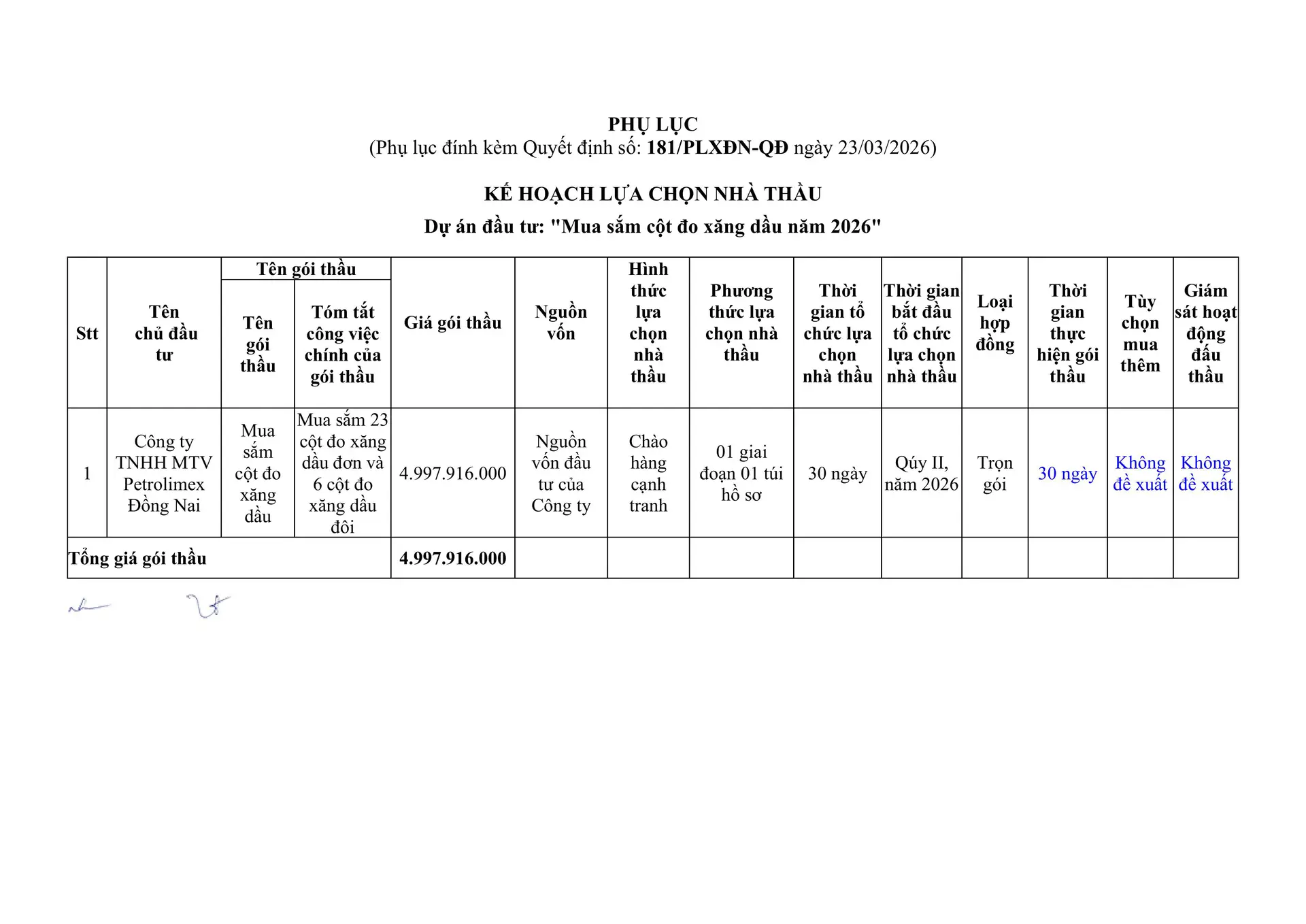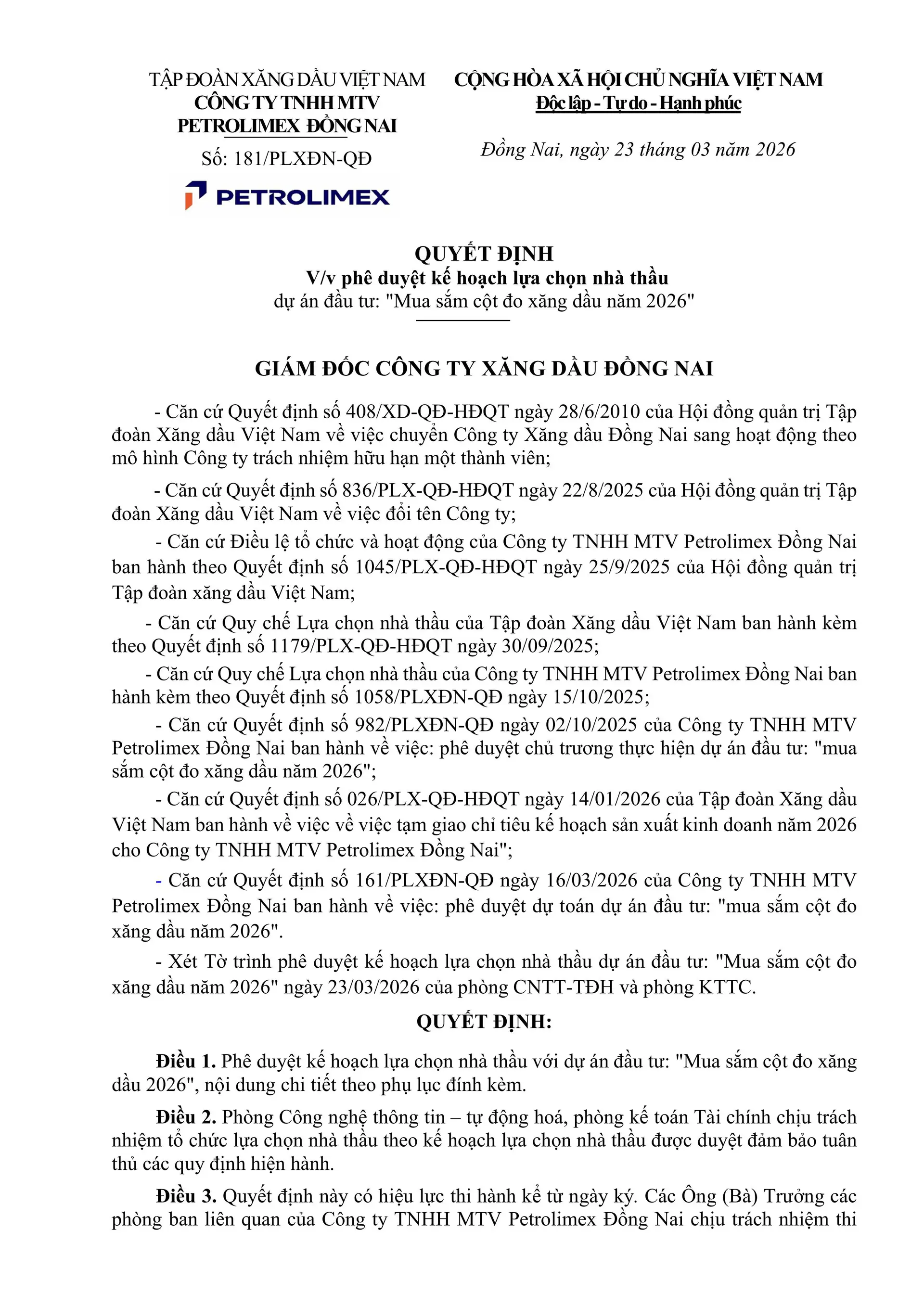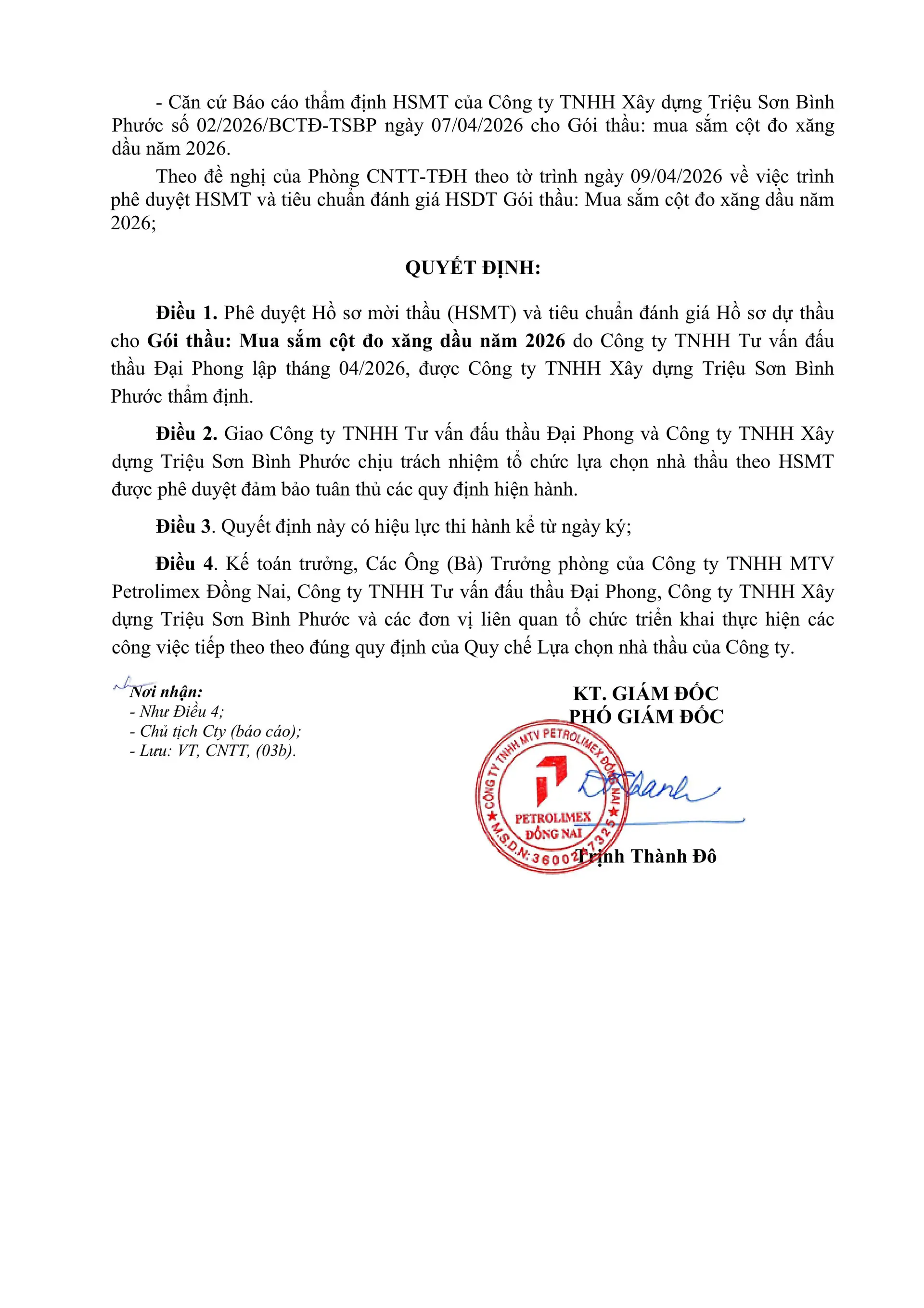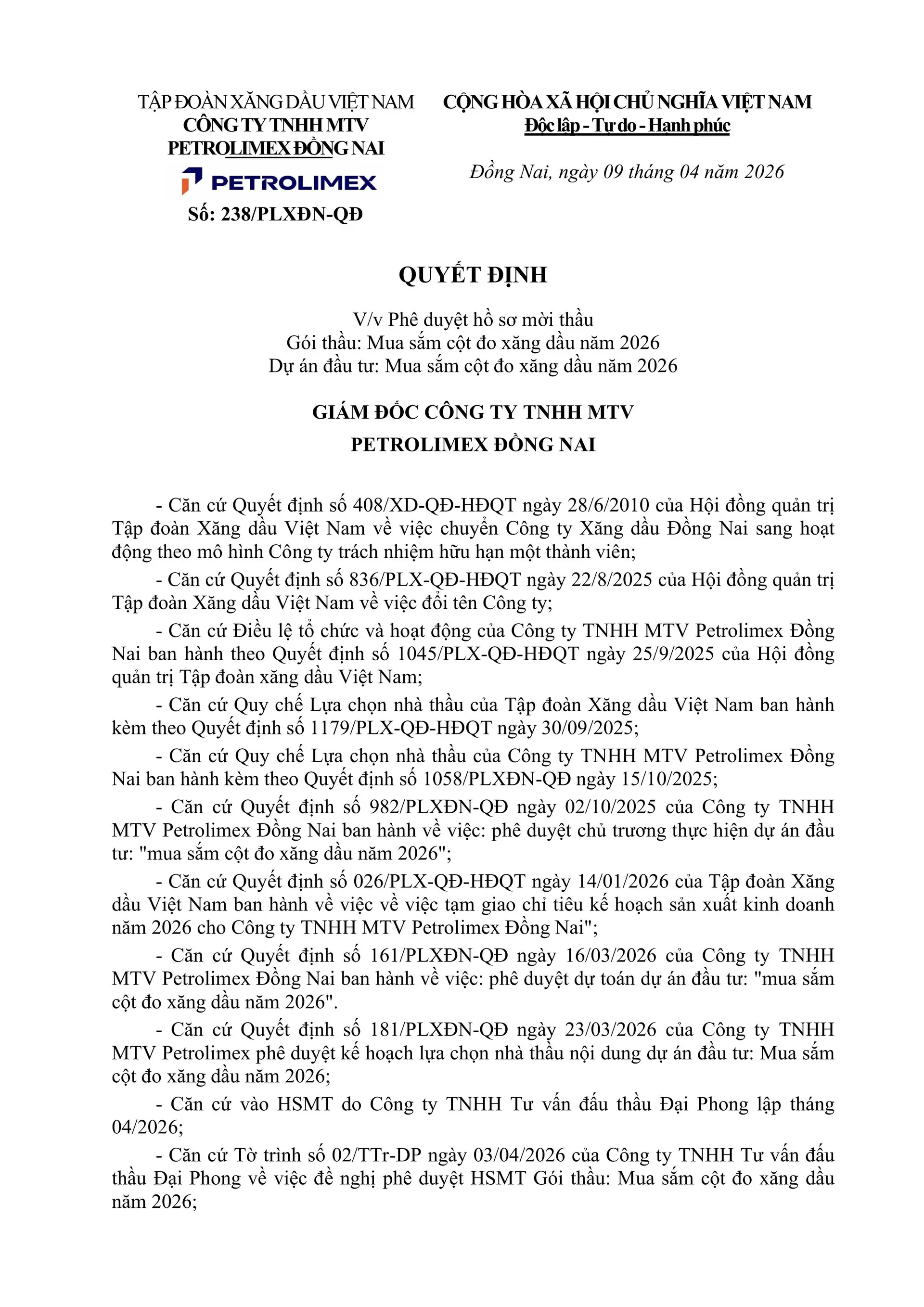 11. QUYẾT ĐỊNH V/v Phê duyệt hồ sơ mời thầu Gói thầu: Mua sắm cột đo xăng dầu năm 2026 Dự án đầu tư: Mua sắm cột đo xăng dầu năm 2026